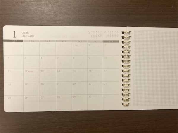左側がカレンダー、右側が方眼になっている薄いリングノートだ。